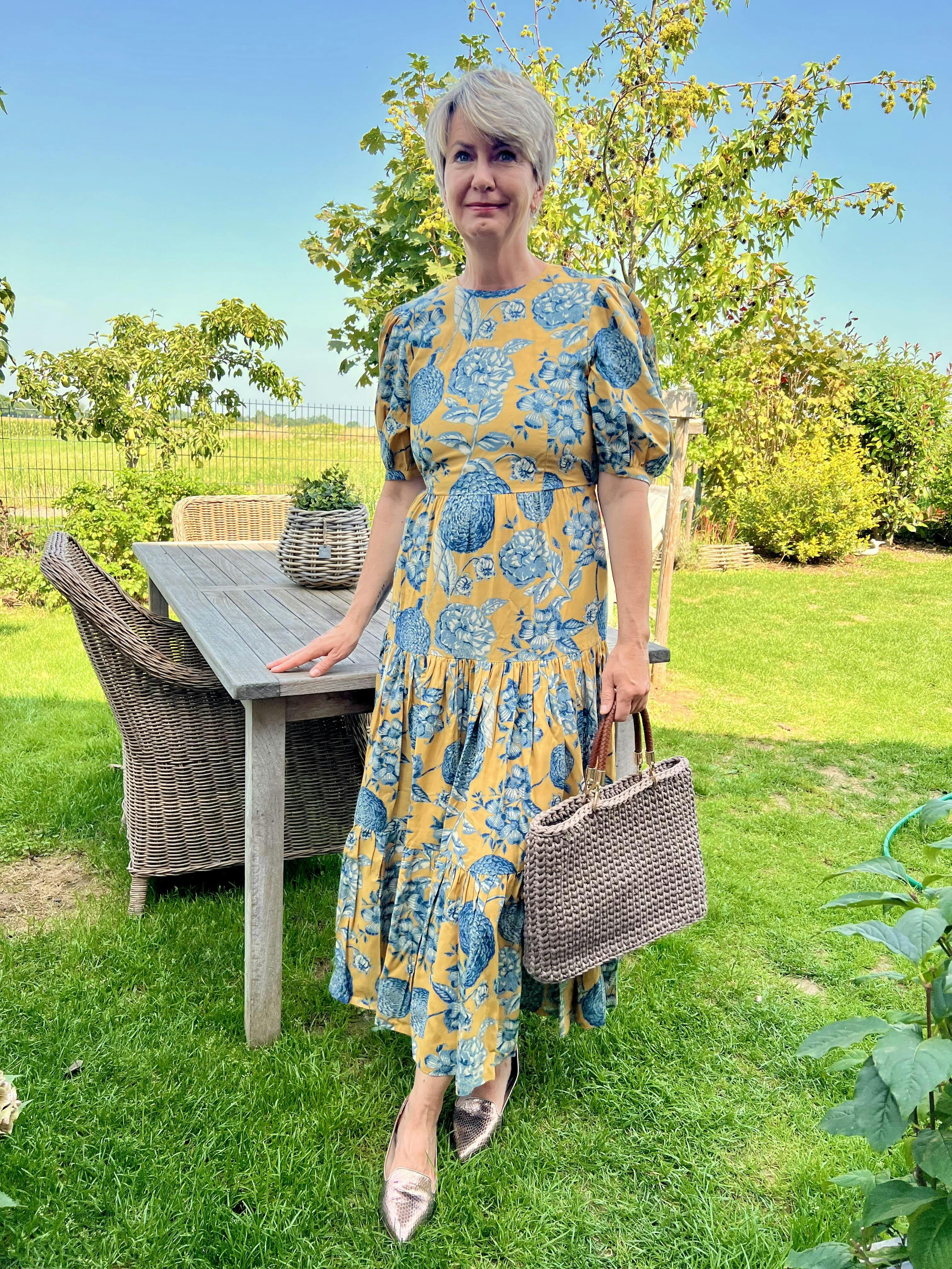 Das Salonette Kleid "Philippa" mit goldgelbem Grund und blauem Blumenmuster ist das perfekte Outfit für die nächste Party! Ob Hochzeitsgast, Geburtstagssause oder Gastgeberin zuhause... Durch den Stoff aus Baumwolle lässt es sich sehr angenehm und lange tragen. Durch den handbedruckten Stoff in Siebdrucktechnik (Screenprint) ist es gleichzeitig besonders edel und festlich.
